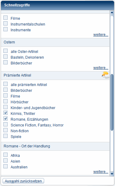SchnellzugriffeNach dem Programmstart sehen Sie auf der rechten Seite des Bibliografie-Fensters die vorhandenen Schnellzugriffe. Mit Hilfe dieser Filter können Sie die Suche auf bestimmte Kategorien und deren Unterkategorien beschränken. Die Kategorien sind mit UND untereinander verknüpft. Wenn Sie also Sprache = Englisch und Elektronische Medien = CD-ROMs wählen, finden Sie nur noch englischsprachige CD-ROMs. Die Unterkategorien der Schnellzugriffe sind mit ODER untereinander verknüpft. Wenn Sie z. B. unter der Überschrift Karten sowohl Wanderkarten als auch Radkarten anhaken, finden Sie beide Artikeltypen.