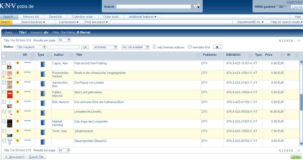 At the top and bottom right you can page forward or back or jump to specific pages. The first column is used to select the titles. The second column indicates whether an image (e. g. the cover) is saved. The third column indicates whether further information such as additional text or an author portrait is available on the title, or whether a title is included in a sales promotion. The SR column shows the number of stars in the star ratings. The number of yellow stars represents the turnover of an article based on order data or, for newly added titles, based on the estimation of KNV purchasing department. In the Author column you will find the author. You will find the title in the Title column. The name of the publisher is given in the Publisher column. The international standard book number or European article number is given in the ISBN/EAN column. The type of cover on the title is indicated in the Type column. You will find the retail price in the Price column. In the IN column you may find an information number that provides information on the availability. Related subjects: |