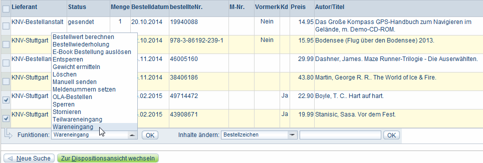 WareneingangMarkieren Sie in der Positionsanzeige des Bestellbuchs eine oder mehrere Positionen.