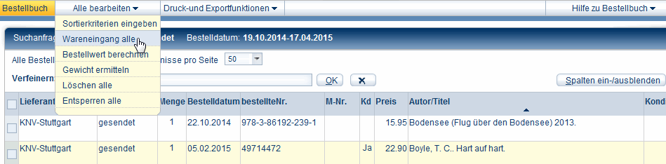 Wareneingang für alle gefundenen BestellungenSie haben auch die Möglichkeit, für alle gefundenen Bestellungen den Wareneingang durchzuführen.