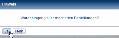 Sie erhalten einen Hinweis mit der Menge der gefundenen Bestellungen. Wenn Sie jetzt auf Ja klicken, erhalten alle Positionen den Status Wareneingang erfolgt.