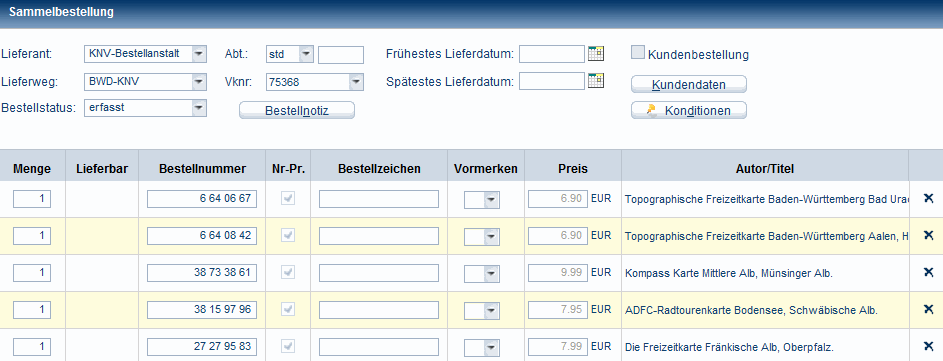 - Klicken Sie auf den Button Konditionen (nur bei Bestellungen über die KNV-Bestellanstalt), um Ihre gewünschten Abweichungen zu den Standardkonditionen einzutragen.