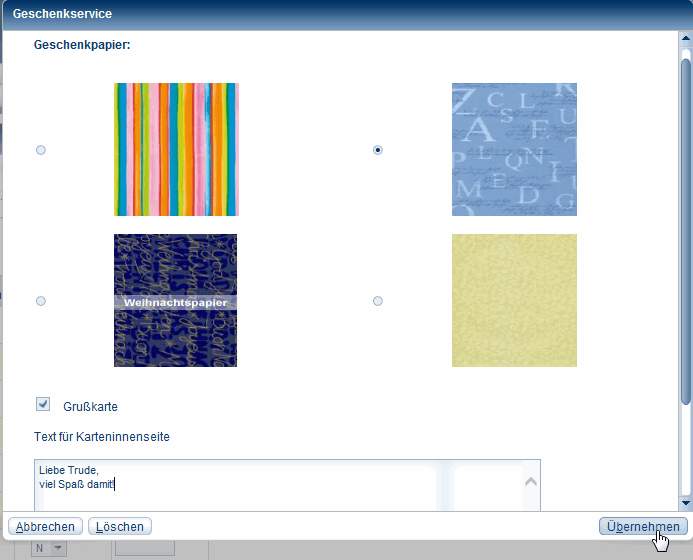 Wählen Sie für Ihren Auftrag hier ein Geschenkpapiermotiv aus. Wenn eine Grußkarte beigelegt werden soll, haken Sie die Checkbox an und tragen einen Text von maximal 500 Zeichen ein.