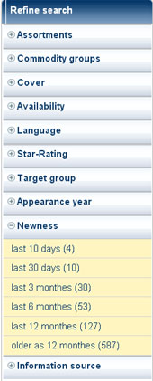 On the left beside the titles found, various categories are displayed that you can use to restrict the number of hits. The number of titles in each category is displayed in brackets.