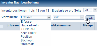 Sie sehen in der Nachbearbeitungsliste sämtliche Artikel, die von allen beteiligten Benutzern bisher erfasst wurden. Links oben und unten in der Anzeige sehen Sie, wie viele Positionen bis zum Aufrufen der Nachbearbeitungsliste erfasst wurden. Mit dem Auswahlfeld können Sie wählen, wie viele Positionen Ihnen auf einer Seite dargestellt werden. Links oben finden Sie die Funktion Verfeinern. Sie können hier nach verschiedenen Kriterien, die Sie aus der Listbox auswählen, die Anzeige der erfassten Artikel filtern. Arbeiten Sie z.B. mit mehren Benutzern oder haben MDE-Geräte im Einsatz, können Sie sich über die Einschränkung Erfasser nur die Artikel eines Benutzers oder die mit MDE-Geräten erfassten anzeigen lassen.