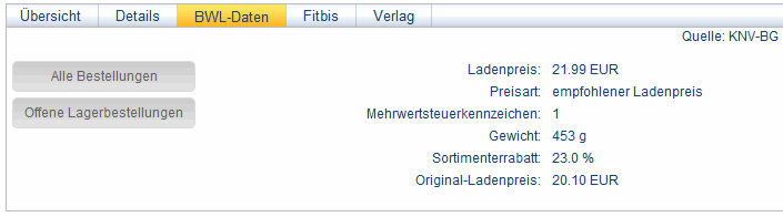 Wird kein Kalkulationsmodell angelegt, werden alle Preise wie in den Datenbanken gespeichert angezeigt. Wenn Sie sich in den BWL-Daten eines Titels mit der Taste "5" den Barsortimentsrabatt eines kalkulierten Titels anzeigen lassen, dann sehen Sie unter Ladenpreis den kalkulierten Preis, während der Sortimenterrabatt vom untenstehenden Original-Ladenpreis abgezogen wird.