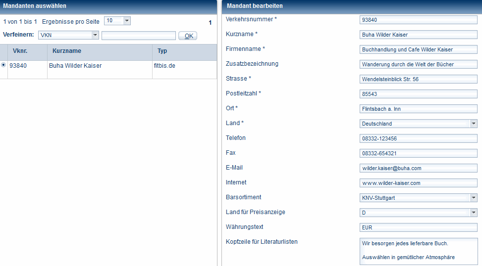 Es werden links unter Mandanten auswählen die angelegten Mandanten mit Verkehrsnummer und rechts unter Mandanten bearbeiten die Daten des ausgewählten Mandanten angezeigt.