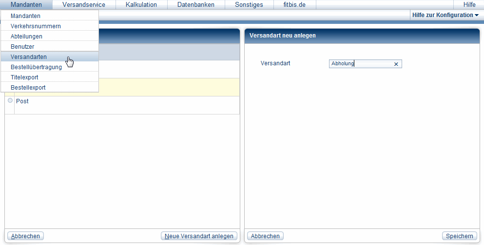 In beiden Fällen können Sie unter Versandart neu anlegen im Feld Versandart eine Versandart eingeben oder ändern