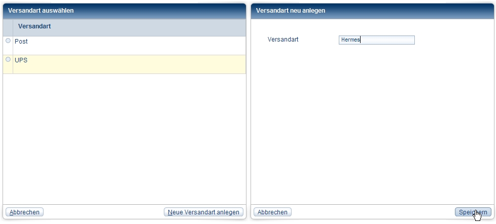In both cases you can enter or change a mode of delivery in Versandart neu anlegen [Add new mode of delivery] in the Versandart [Mode of delivery] field.