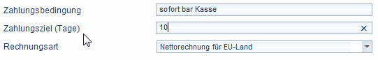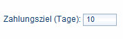 Geben Sie hier das gewünschte Zahlungsziel ein. Wenn für dieses Feld bereits ein Wert aus der Stammadresse übernommen wurde, so wird dieser nur für diese Rechnung überschrieben.