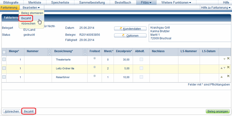 Hat Ihr Kunde die Rechnung bezahlt, so können Sie diese als bezahlt kennzeichnen und so aus der Liste der überfälligen Rechnungen entfernen. Anders als bei Buchverkäufen kann fitbis.de diese Daten nicht von der Kasse übernehmen.