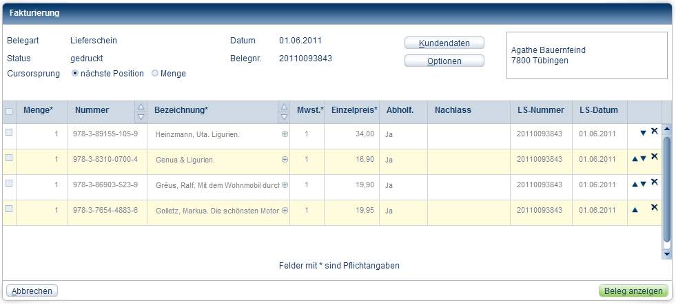 Vollanzeige eines BelegesWenn Sie in der Beleganzeige auf einen der Belege klicken, öffnet sich die Vollanzeige des Beleges. Je nach Status des Belegs können Sie die Positionen nur ansehen und den Beleg gegebenenfalls stornieren oder die Positionen des Belegs bearbeiten, löschen oder ergänzen. Unbearbeitete, geparkte oder abgebrochene Belege