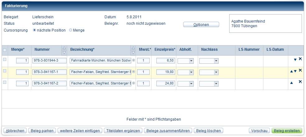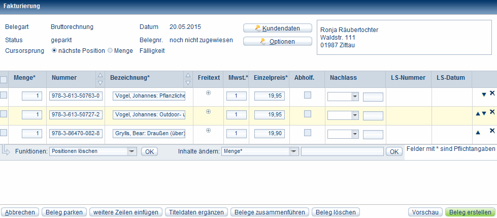 Bei unbearbeiteten oder geparkten Belegen können die Daten der Positionen wie Menge oder Einzelpreis geändert werden (Außer bei Rechnungen, die aus Lieferscheinen entstanden sind: In diesem Fall wird aus Sicherheitsgründen keine Abweichung gegenüber dem Lieferschein zugelassen.). Außerdem können Sie weitere Zeilen einfügen, Belege zusammenführen, den Beleg löschen, eine Vorschau erstellen oder den Beleg abschließen. Gedruckte oder stornierte Belege