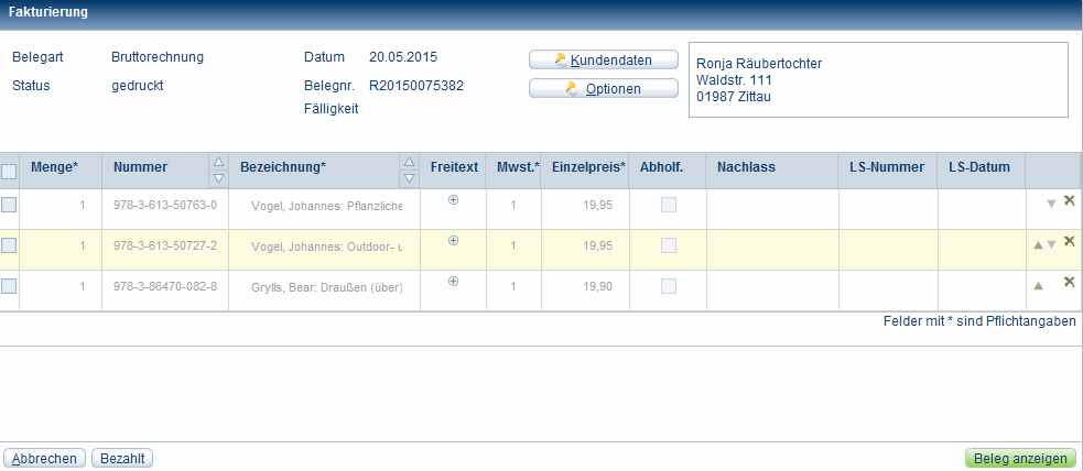 Bei gedruckten und stornierten Belegen können Sie die Einzelpositionen zwar sehen, aber nicht mehr bearbeiten. Die Belege können gegebenenfalls als bezahlt gekennzeichnet oder storniert werden. Außerdem können Sie sich die Druckversion der Belege als PDF anzeigen lassen. < Zurück |