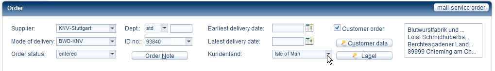 If the Country field of the customer's address is already filled with a valid ISO country code, e.g. DE, the customer's country of origin is already given in the Kundenland [Customer country] field (this field appears only with e-books), in this example Germany. When you save the order, the Allgemeine Geschäftsbedingungen [General terms and conditions] window opens automatically with your customer's address, the required e-book and your terms and conditions of delivery and use that you can print out and present to your customer. The order is added to the order book with the status E-Book entered. Once the customer has accepted the general terms and conditions, the customer can then pay for the e-book in advance at the checkout. |