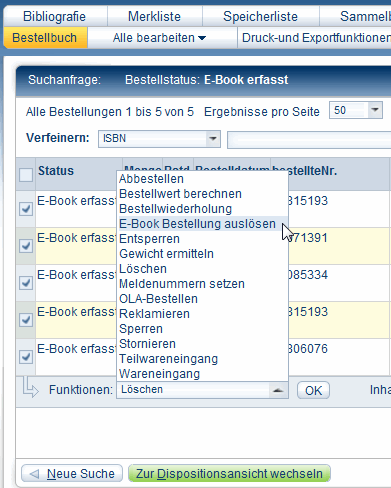 Wählen Sie im Menü Funktionen den Punkt E-Book Bestellung auslösen. Jetzt wird das das E-Book bestellt.
