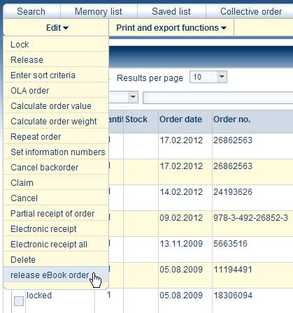 Triggering e-book orderOnce the customer has agreed the general conditions of use and the general terms and conditions, you must finally trigger the e-book order. For this purpose find the order; it has the status E-Book entered. On the Edit menu select the release eBook order item. The e-book is now actually ordered. The customer receives in your name an e-mail with the link for the download. Related subjects: