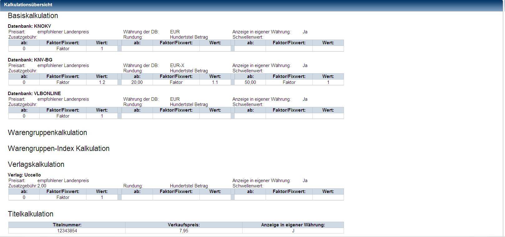 Overview of all pricing models addedThe configuration program provides a tabular overview of all existing pricing models. On the Kalkulation [Pricing] menu select the Kalkulationsübersicht [Pricing overview] command. You can print the overview to make it easier to check the pricing models. Related subjects: