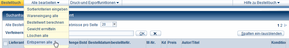 Über den Menüpunkt Alle bearbeiten können Sie alle Treffer einer Bestellsuche auf einmal bearbeiten. Klicken Sie unter Alle bearbeiten z.Bsp. auf Entsperren alle, um die vorher auswählten, gesperrten Bestellungen freizugeben. Nach Bestätigung im Hinweisfenster erhalten Ihre Bestellungen den Status erfasst. Werden Ihre KNV-Barsortimentsbestellungen als Sofortbestellung ausgeführt, werden diese nun übertragen und bekommen den Status gesendet. Analog zum Entsperren können Sie auch für eine komplette Liste gesendeter Bestellungen den Wareneingang durchführen (Wareneingang alle) oder zum Aufräumen des Bestellbuchs eine Liste alter Bestellungen komplett löschen (Löschen alle).