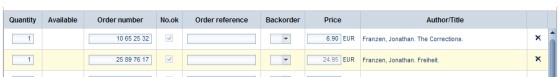 Initially the Quantity field contains 1. If necessary change the number of copies. The check box in the number check column, No.ok, is only selected if you have entered an ISBN. You can also order titles without a number check. To identify your order on the delivery note, the book label and, if necessary, also the order slip, enter for instance the customer name or the code for the originator of the order in the Order reference field (do not use any special characters). If you want to use different backorder modalities to those set for you by default, select a backorder ID in the Backorder field. O stands for optimised forwarding. This means that the order is automatically forwarded to the publisher via the ordering organisation if the title is not available at the wholesaler's. Titles with the information numbers 11, 12, 15, 21, 25, 62, 80 are temporarily out of print and and can be backordered; Orders with these information numbers are therefore not forwarded to the publisher. The table can also be supplemented with the entry of further title numbers, ISBNs, EANs or series numbers. You can remove titles that in end you decide you do not want to order by clicking the X at the extreme right of the row.