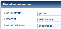 Die Suchkriterien werden in die Suchmaske übernommen (im Beispiel Bestellstatus: gesperrt und Lieferant: KNV) und die Suche wird sofort durchgeführt.