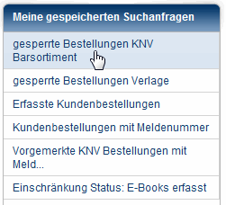 • Klicken Sie im Bereich Meine gespeicherten Suchanfragen auf eine der Anfragen (im Beispiel auf gesperrte Bestellungen KNV).