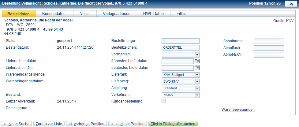 - Klicken Sie auf Verlagsadresse oder BWL-Daten, um diese Informationen zu einer Bestellposition einzusehen.