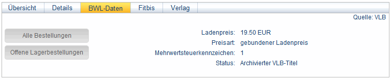 Es werden zusätzlich der Rabatt und eventuell ein vorhandener Staffelrabatt angezeigt. Mit den Buttons Alle Bestellungen und Offene Lagerbestellungen können Sie zum Bestellbuch wechseln und sich Bestellungen bzw. offene Bestellungen zu einem Titel anzeigen lassen. Sind z.B. offene Lagerbestellungen zu dem angezeigten Titel vorhanden, wird der Button in blauer Schrift angezeigt, sind keine Bestellungen vorhanden, ist der Button ausgegraut. Wenn in der VLB Datenbank Preise als Referenzpreise gekennzeichnet sind, sehen Sie in der KNV Datenbank in allen Ansichten der Titelanzeige beim MouseOver in den Preisfeldern einen Tooltip VLB-Referenzpreis. Diese Preise gelten als verbindlich. Titel aus dem VLB Archiv haben den Status: archivierter VLB-Titel: Bei einem eBundle bekommen Sie in den BWL-Daten die Zusammensetzung der Mehrwertsteueranteile angezeigt: